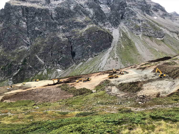 Zum Schutz der beiden Teiche wird ein Lawinendamm mit bewehrter Erde aufgebaut. Der Damm erstreckt sich auf eine Länge von ca. 300 m.